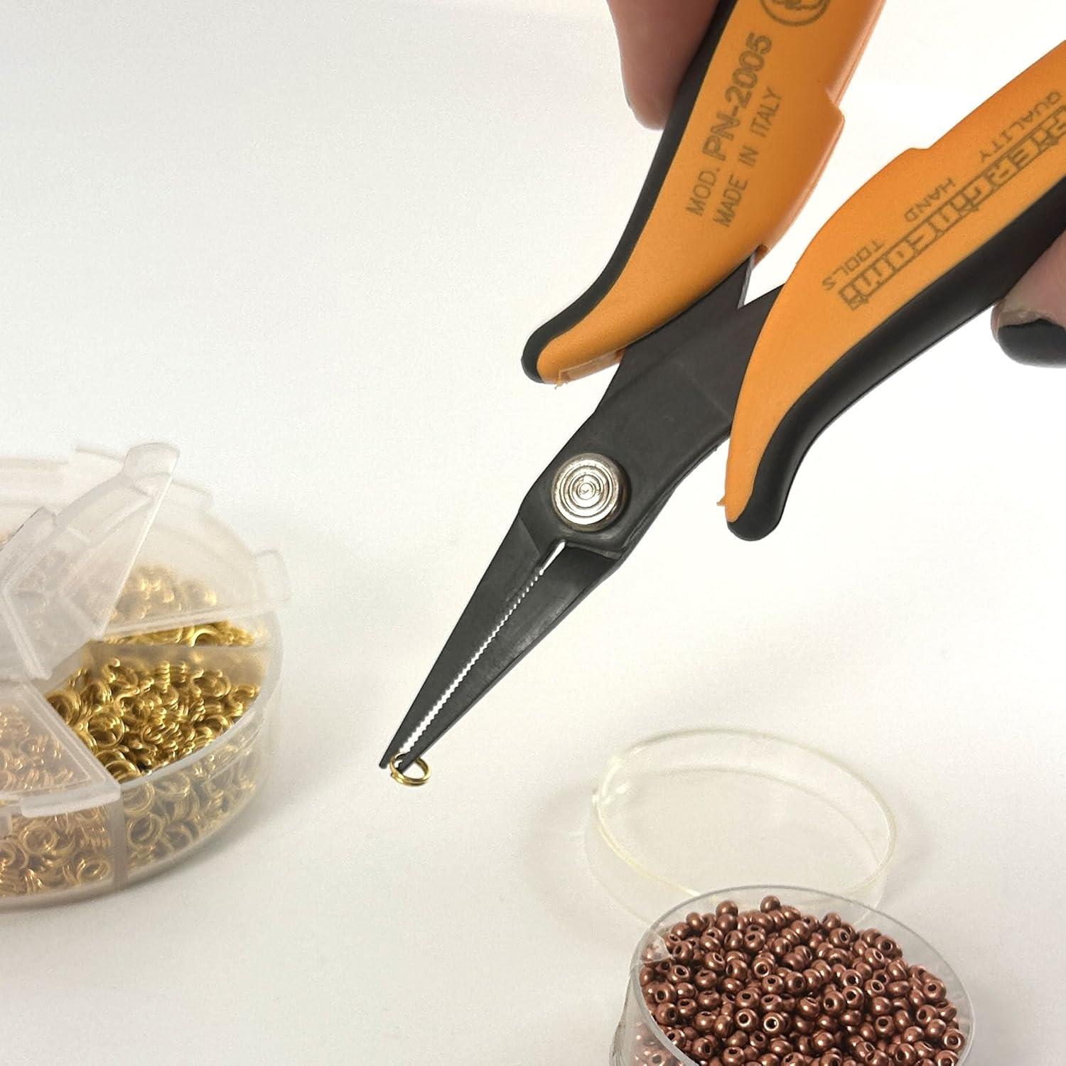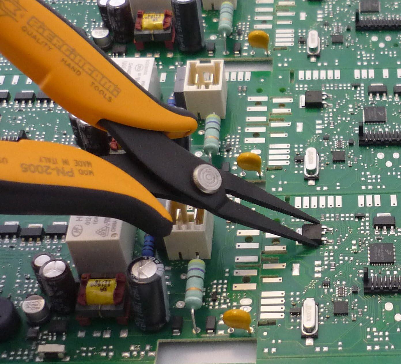 The PN 2005 is a pair of needle-nose pliers with long serrated jaws, suitable for gripping components in hard-to-reach areas and for delicate electronics applications.